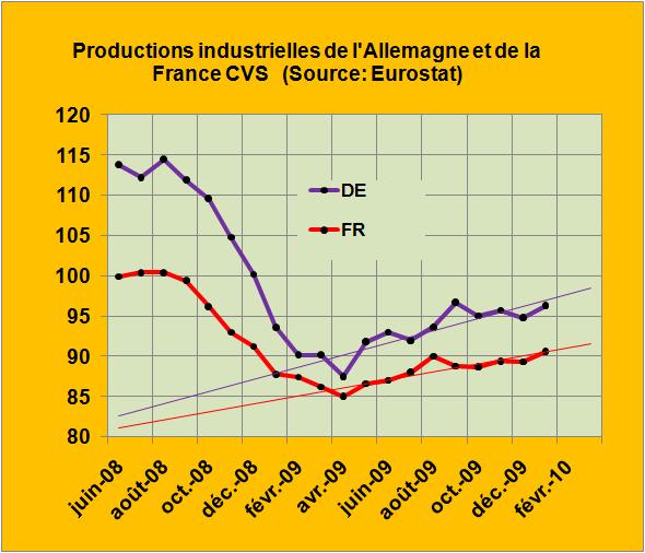 Une analyse graphique du comportement industriel de l’Allemagne et de la France (FIG.) montre que le processus de rétablissement de la France est toujours très lent (courbe rouge) et que celui de l’Allemagne stagne depuis cinq mois consécutifs (courbe violette). Avec la fin des intempéries et un moindre impact du poste énergie, il faudra s’attendre donc à une poursuite de ce processus de stagnation industrielle des plus inquiétants.