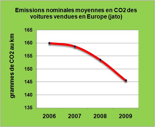 Conséquences de ces évolutions commerciales et technologiques, les émissions nominales moyennes de CO2 des véhicules vendus en 2009 ont fortement chuté (FIG.II).