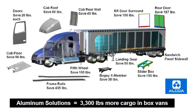 Pour les poids-lourds, leur activité est étroitement corrélée à l’activité économique et il est connu par ailleurs que cette activité en Europe est très faible. Par contre les ventes de ces poids-lourds ayant fortement régressé le taux de renouvellement du parc est très faible en ce moment. Cependant de bonnes avancées dans l’économie des carburants peuvent être obtenues par l’optimisation de la logistique soit à l’échelle européenne mais aussi à l’échelle d’un pays ou d’une région. L’introduction de structures légères en aluminium par exemple dans la définition des poids lourds (FIG.III, étude d’Alcoa) est également un facteur important d’optimisation de la charge.