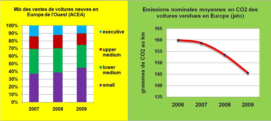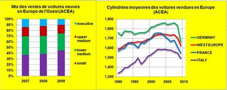 Sous l’impulsion des mesures financières d’incitations gouvernementales, de la demande de la majorité des consommateurs pour des véhicules à prix réduits et d’une nouvelle approche marketing des constructeurs mettant en avant des véhicules moins polluants et donc moins avides de carburants, un retournement des ventes au profit des petits véhicules s’est nettement dessiné depuis deux ans. En 2009, les ventes des catégories « small » et « lower medium » ont atteint 75% des volumes (FIG.), en parallèle la cylindrée moyenne des voitures neuves commercialisées a fortement chuté et la dispersion entre grands pays s’est considérablement réduite.