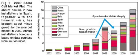 Après la débandade des autorités espagnoles en 2008 qui, effrayées par la croissance incontrôlée de la facture, avaient subitement stoppé toutes les autorisations d’implantation de modules solaires sur le territoire, de tristes prévisions d’activités avaient été réalisées pour l’exercice 2009. i-Suppli au mois d’Avril avait prévu un marché 2009 de 3,5GW (LIRE) qui devait succéder au marché 2008 de 6 GW. Nomura Securities pronostiquait également des volumes commercialisés en baisse pour 2009 (FIG.) autour des 5 GW.
