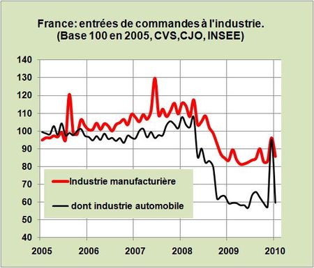 Au mois de Décembre dernier les commandes à l’industrie française avaient connu une embellie, tirées par les commandes opportunistes d’automobiles à la veille d’une baisse des primes d’Etat. L’indice INSEE, base 100 en 2005, était passé de 83.2 en Novembre à 96.3 en Décembre (+13,5 %): la reprise était en marche. Mais voila, il faut déchanter: au mois de Janvier l’indice qui revient à 85,9 soit -9,4%, se positionne ainsi sur une tendance de reprise très molle de l’activité (FIG.).
