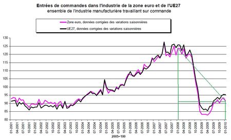 Les petites variations d’un mois sur l’autre n’ont que bien peu de signification. On sait par exemple que cet indice avait été artificiellement gonflé pour la France au mois de Décembre par les commandes anormales d’automobiles. Une comparaison par rapport à il y a deux ans, en Janvier 2008, montre que cet indice a chuté de 26%. Il ressort à 85,9 pour la France et à 97,3 pour l’Allemagne.