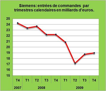 Ne vous-y trompez pas! L’industrie allemande triomphante c’était avant la crise, avant l’euro trop fort, avant le décollage de l’Asie qui voulait alors s’équiper à tout prix. Alors les grands patrons d’industrie allemands se posent des questions sur comment tenir le coup face à la concurrence américaine et asiatique. C’est le cas de Peter Löscher qui publie une interview dans le Financial Times de ce matin. « Siemens seeks to stead ahead of Asian rivals », annonce le titre. Il cherche à rester devant dans une ambiance de surcapacité de ses clients potentiels et de reprise molle (sluggish). Et pour Löscher il n’y a qu’une approche pour résister: garnir ses offres de prestations de services qui lui assurent une meilleure rentabilité et des revenus récurrents. Assurer la maintenance du parc d’équipements commercialisé semble être la voie à suivre. C’est ce qu’il fait dans les éoliennes offshore dont Siemens est leader mondial. Mais quels que soient les propos rassurants de ce capitaine d’industrie, un examen des entrées de commandes trimestrielles de Siemens, depuis un peu plus de deux ans, illustre parfaitement la chute des commandes observée sur les quatre trimestres consécutifs à cheval sur 2008-2009. Malgré une certaine reprise au cours du deuxième semestre 2009, la tendance n’est pas terrible. Je vous propose donc de remplacer le portrait de PL du Financial Times par cette courbe…c’est beaucoup plus parlant.
