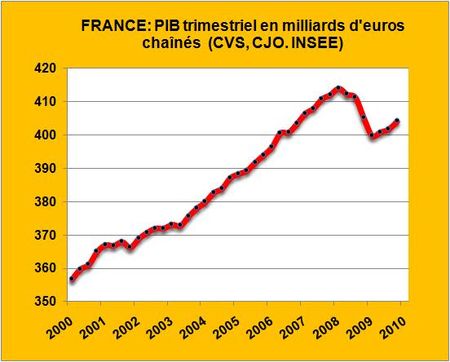 LIRE le communiqué de l’INSEE, dont le titre « Fin 2009, le PIB accélère » ressort de la Méthode Coué.