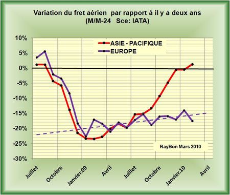 Le fret aérien en Europe s’est accru en Février 2010 de 7,2% par rapport à celui du même mois de 2009 informe l’IATA. Bravo me direz-vous? Mais cette institution oublie de nous dire que ce même fret en Février 2009 avait plongé de 23% par rapport à celui de 2008. Il résulte de ces deux effets antagonistes que le fret aérien en Février 2010 a baissé de 17% par rapport à celui du même mois de 2008 qui, il est vrai, avait compté un jour de plus.