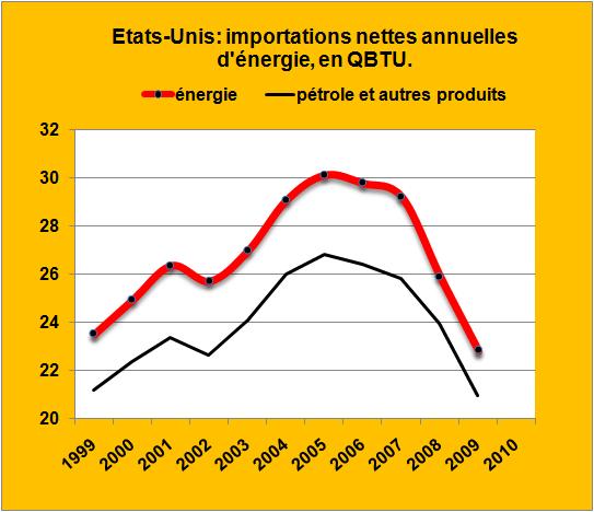 Pour illustrer l’impact de cette forte baisse de la demande, bien souvent sous-estimée, il est intéressant de bien mesurer ce qui s’est passé aux Etats-Unis depuis quatre ans. Entre 2005 et 2009, les importations nettes d’énergie des USA nous dit l’EIA sont passées de 30,1 QBTU à 22,8 QBTU ce qui représente une baisse de 24% en quatre ans (FIG., courbe rouge). Parmi les diverses composantes de ce retrait, ce sont les importations nettes de pétrole et de produits pétroliers qui apportent la contribution majeure avec une chute de 26,8 QBTU à moins de 21 QBTU (FIG., courbe noire) soit une baisse de 22%. Le restant est imputable à la baisse des importations de gaz naturel dont les Etats-Unis regorgent. Ces baisses d’importations sont dues à la décroissance des consommations de pétrole par les foyers et les industries américains, à la montée en puissance des biocarburants, à l’accroissement des productions autochtones de pétrole (Golfe du Mexique) et de gaz naturel (gaz de schistes).