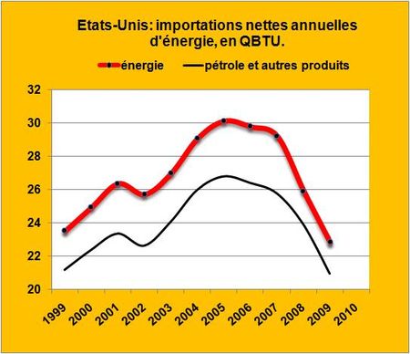 FIG.  Les importations d’énergie des Etat-Unis sont passées en-dessous de leur niveau de 1999. (Rem.: un quadrillion de BTU vaut 293 TWh thermiques)