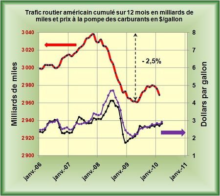 Le trafic routier américain dont les données sont publiées tous les mois par la Federal Highway Administration, avait débuté sa décroissance en Décembre 2007, donc bien avant la crise, alors que le prix des carburants à la pompe étaient passés au dessus du seuil psychologique de 3 dollars le gallon (FIG., courbe rouge pour le trafic, courbe noire et violette échelle de droite pour l’essence et le gasoil). Ce mouvement de baisse du trafic, paramètre déterminant dans la baisse des consommations de carburants américains, avait alors connu jusqu’en Mai 2009 une forte décroissance globale de 2,5%. Puis, le gros de la crise étant passé, le trafic routier avait tout naturellement repris en intensité au cours de la deuxième partie de 2009, mais semble-t-il limité par par une reprise molle et un accroissement des prix des carburants à la pompe. Depuis deux mois ce trafic a même affiché un recul avec des -1,6% en Janvier et -1,4% en Février sur les données mensuelles par rapport aux mêmes mois de l’année précédente.