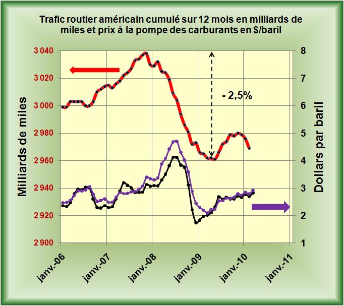 Le trafic routier américain dont les données sont publiées tous les mois par la Federal Highway Administration, avait débuté sa décroissance en Décembre 2007, donc bien avant la crise, alors que le prix des carburants à la pompe étaient passés au dessus du seuil psychologique de 3 dollars le gallon (FIG., courbe rouge pour le trafic, courbe noire et violette échelle de droite pour l’essence et le gasoil). Ce mouvement de baisse du trafic, paramètre déterminant dans la baisse des consommations de carburants américains, avait alors connu jusqu’en Mai 2009 une forte décroissance globale de 2,5%. Puis, le gros de la crise étant passé, le trafic routier avait tout naturellement repris en intensité au cours de la deuxième partie de 2009, mais semble-t-il limité par par une reprise molle et un accroissement des prix des carburants à la pompe. Depuis deux mois ce trafic a même affiché un recul avec des -1,6% en Janvier et -1,4% en Février sur les données mensuelles par rapport aux mêmes mois de l’année précédente.