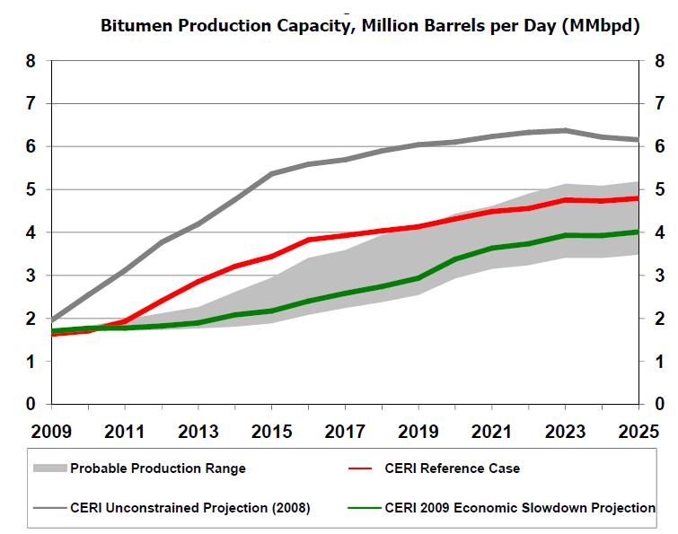 Le CERA confirme que ces productions pourraient atteindre entre 3,1 et 5,7 millions de barils/jours en 2030 ce qui représenterait un triplement ou un quadruplement des productions par rapport à aujourd’hui. Le Canadian Energy Research Institute avait publié en 2009 des prévisions du même ordre dès 2025 (FIG.II).