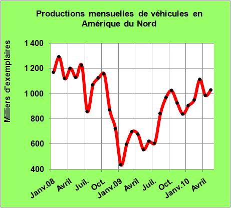 La reprise économique serait en marche aux États-Unis. Les statistiques de productions de voitures au mois de Mai sur le continent nord-américain ont dépassé le million d’exemplaire (1,030 million) en croissance de plus de 85% par rapport au même mois de l’an dernier qui avait été un des pires de la période. Elles restent cependant inférieures aux productions d’il y a deux ans qui avaient atteint 1,128 million d’exemplaires (FIG.I).