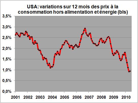 Malgré cette amorce de mouvement de reprise il est à noter que les prix sont restés globalement stables aux États-Unis. Les dernières statistiques du Bureau of Labor Statistics font apparaître pour le mois de Mai une variation sur douze mois de l’indice des prix hors énergie et alimentation inférieure à 1%. C’est le deuxième mois consécutif affichant une hausse aussi faible (FIG.II), record historique.