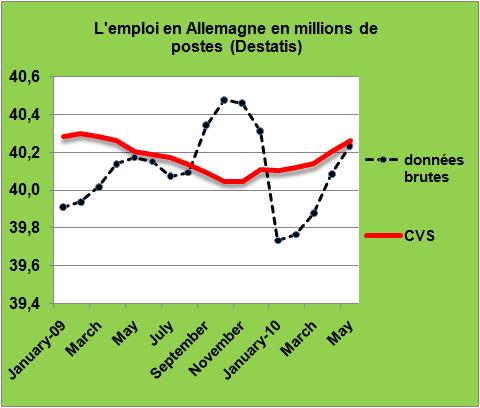 Il est bien évident que l’emploi en Europe sera un des paramètres majeurs pour consolider une éventuelle reprise économique. Stabilisé en France au premier trimestre de cette année, il semble décidé à croître en Allemagne. Entre le mois de Janvier et le mois de Mai le nombre d’emplois s’est accru de près de 500 mille postes (FIG., courbe noire). Corrigé des variations saisonnières ce sont 200 mille postes (0,5%) qui ont été créés depuis 6 mois en Allemagne (courbe rouge). L’emploi au mois de Mai 2010 à 40,23 millions de postes, se retrouve en légère progression de 60 mille postes par rapport à son niveau atteint en Mai 2009.
