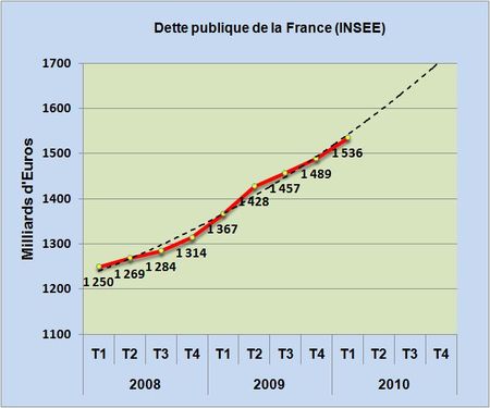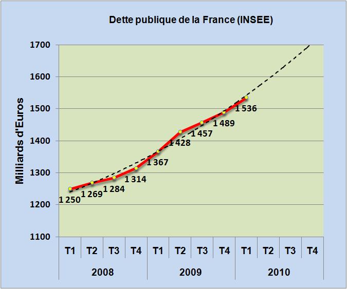 Rien ne semble vouloir endiguer la progression quadratique de la dette publique de la France. Alors que le rythme de croissance trimestrielle semblait s’être stabilisé autour des 30 milliards durant les deux derniers trimestres 2009, voila le premier trimestre 2010 qui avec une dette cumulée de 1535 milliards d’euros affiche une croissance séquentielle de plus de 46 milliards d’euros (FIG.). Ce montant cumulé représente plus de 80% du PIB nous indique l’INSEE, soit une progression de 11 points par rapport au même trimestre 2009.