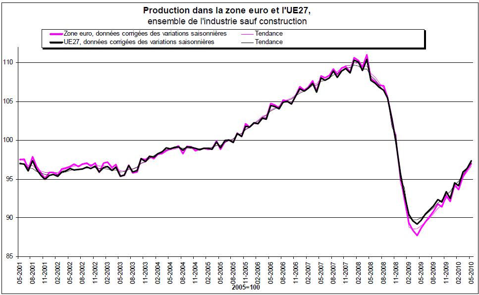 Les données d’Eurostat nous apprennent, sans surprise, que la production industrielle du mois de Mai dans l’ Eurozone s’est améliorée de 0,9% en un mois et de 9,4% en un an. Ce résultat (FIG.) est en accord avec la reprise du fret aérien en Europe et avec la forte croissance de la production industrielle allemande tirée par l’export.
