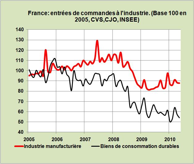 Mauvaises nouvelles pour l’activité à venir des industries françaises, les entrées de commandes à l’industrie manufacturière au mois de Mai, ont baissé de 1,2% par rapport à celles du mois précédent (FIG., courbe rouge). Ces entrées de commandes subissent la lente mais inexorable dégradation des entrées de commandes des biens de consommation durables qui sont les biens destinés à la consommation finale des ménages pour une durée supérieure à un an (FIG., courbe noire). Cette dégradation a trois origines:
