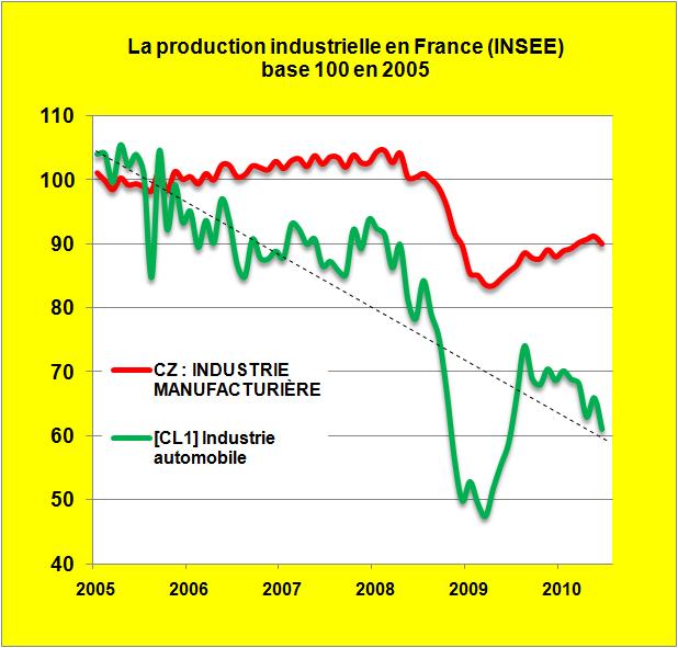 L’industrie manufacturière française a déjà connu plusieurs catastrophes industrielles telle que l’effacement de son industrie textile et de l’habillement qui ne représente plus aujourd’hui que 3% de l’activité globale. Mais elle est en train de voir disparaître un nouveau pan de son activité: c’est l’industrie automobile qui elle représente encore 10% de l’industrie manufacturière. C’est ainsi qu’au mois de Juin l’industrie hors construction, énergie, eau et industries extractives (CVS,CJO) vient de perdre 1,3% nous informe l’INSEE, tirée vers le bas par le poste automobile qui décroît pour sa part de 7,4% en un mois (FIG.).