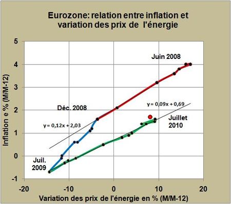 1) entre Juin 2008 et Décembre 2008 (courbe rouge) l’inflation (M/M-12) déterminée par la puissante chute des cours du pétrole, du gaz naturel indexé et du charbon à perdu 2,4 points en six mois avec une relation linéaire de 1,2 points par 10 points de baisse des prix de l’énergie.