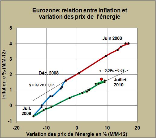 3) enfin, à partir de Juillet 2009 (courbe verte) on assiste à une remontée de l’inflation avec la croissance des prix de l’énergie selon une droite moins sensible que celle de 2008. Elle affiche en effet, jusqu’en Juin 2010, une pente de 0,9 point d’inflation pour 10% de variation des prix de l’énergie. La crise a partiellement désensibilisé les prix de la zone euro aux variations de prix de l’énergie, conséquence d’une économie moins dépendante aux ressources énergétiques fossiles comme l’illustre la baisse des consommations de pétrole observée en Europe.