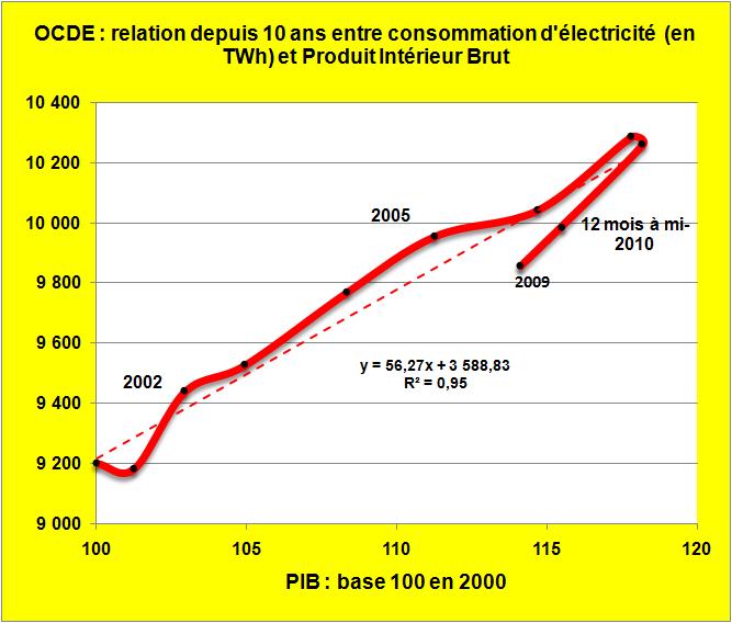 Alors qu’il n’existe plus aucune relation entre PIB et consommation de pétrole au sein de l’OCDE, il en existe une très claire entre PIB et consommation d’électricité (FIG.). Entre 2000 et 2008 la relation linéaire (R 2 =0.98) établissait une pente de 60 TWh par point de PIB (indice 100 en 2000). Les fortes perturbations économiques de 2009 ont un peu dégradé cette linéarité qui se retrouve tout de même sur les six premiers mois de 2010 avec au sein de l’OCDE une consommation d’électricité cumulée sur les 12 derniers mois proche des dix mille TWh.