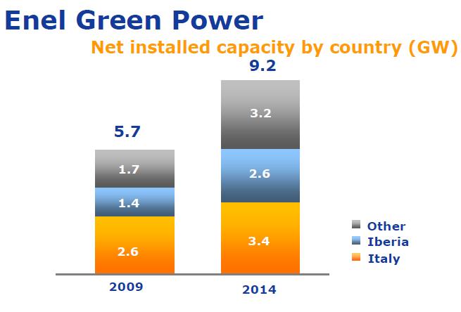 Dans ce cadre très délabré des cours des industries du green business en Europe en voici un nouveau qui veut être introduit en Bourse: l’italien-espagnol Enel Green Power qui affiche de grandes ambitions dans les énergies renouvelables. Avec un CA de 2,1 milliards d’euros en 2009, EGP dispose d’une puissance de production installée de 5,7 GW (FIG.) dans laquelle Enel a eu la sagesse de faire rentrer les générations hydroélectriques (2,5 GW) et géothermiques (0,7GW) auxquelles il faut ajouter 2,3 GW de puissance éolienne et 0,2GW dans la biomasse et le solaire. Son objectif, grâce à des investissements de plus de 5 milliards d’euros d’ici à 2014, est d’accroître sa puissance installée de 3,5 GW (FIG.).