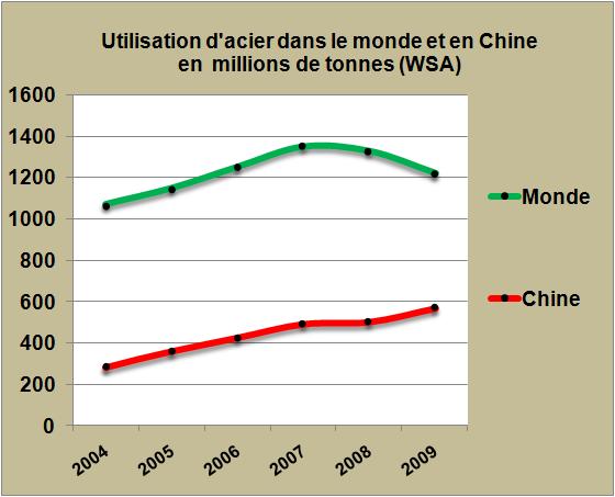 Pour 2011 la WSA ne prévoit pour l’instant qu’une croissance mondiale de l’utilisation apparente d’acier de 5,3%, arguant d’un ralentissement de la croissance en Chine (3,5%) qui représenterait alors 45% des consommations mondiales.