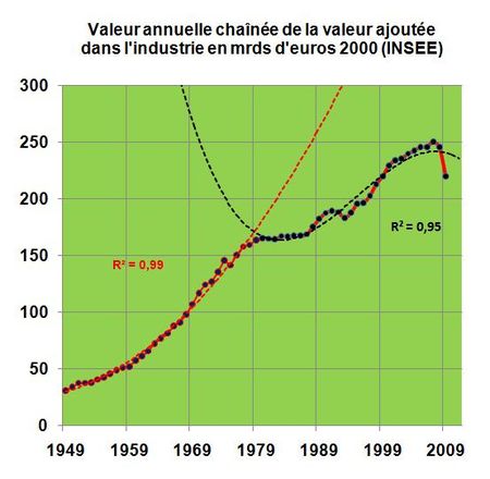 Dans un article de G. Kaplan, paru sur Causeur.fr, de façon cocasse intitulé « Désindustrialisation? Un bobard » il est montré de façon irréfutable que la France connaît une industrialisation soutenue. En effet en 2009 la valeur ajoutée chainée publiée par l’INSEE était « 570% plus élevée qu’en 1949 ». Mais, me direz-vous, ce blog n’est pas un haut lieu d’analyse de l’économie et il est normal que ses papiers sur le sujet soient assez schématiques afin que le lecteur lambda s’y retrouve. Alors essayons d’aller un peu plus loin dans l’analyse. Dans les faits entre 1949 et 2009 la croissance industrielle de la France a connu une loi de progression sensiblement linéaire, ce qui signifie que la croissance annuelle est allée globalement en régressant durant ces 60 années. Une analyse un peu plus fine (FIG.) permet de distinguer deux grandes périodes: l’une correspondant sensiblement aux trente glorieuses entre 1949 et 1979 où la croissance industrielle obéit à une loi exponentielle avec une progression moyenne annuelle de 5,7%. L’autre période que je nommerai plutôt « les trente foireuses » qui ont connu le triomphe du socialisme et de ses trente cinq heures, le principe de précaution, symbole si peu gaulliste s’il en est, les excès financiers en tous genres, la mondialisation loupée des échanges et l’endettement stupide des finances publiques de notre pays.