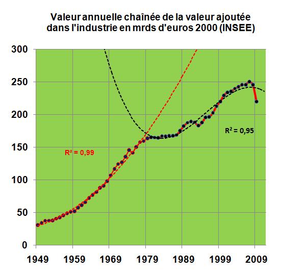 La loi de variation de la croissance industrielle durant cette deuxième phase qui mériterait une analyse détaillée de toutes les stupides décisions prises par nos énarques et autres polytechniciens (Minitel, Plan Calcul, Industrie de l’Aluminium, Eolien, Génie Génétique, etc.), est alors beaucoup plus complexe puisqu’elle se termine par une décroissance de la production industrielle de plus de 12% sur la période 2008-2009.