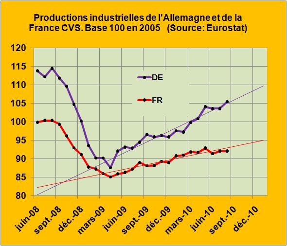 Un examen de la « reprise » industrielle comparée entre l’Allemagne et la France à fin Août oblige à être profondément pessimiste pour 2010 et les années à venir (FIG.II). Avec en 2010 un indice 92 base 2005, il faut attendre pour cette année une valeur ajoutée dans l’industrie autour des 226-228 milliards d’euros, bien au-dessous des 250 milliards de 2007. N’en déplaise à G.K.et ses analyses rustiques, la croissance industrielle est mal en point dans notre pays…et c’est bien dommage. Les déconvenues récentes dans le nucléaire et le TGV montent que même les activités prestigieuses sont menacées.