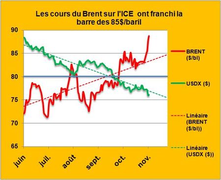 Nous avons assisté pour le Brent en début de semaine à un franchissement très rapide de la barre des 85$/baril (FIG., courbe rouge) atteignant des niveaux bien au dessus de la droite de corrélation des cinq derniers mois (pointillés rouges) alors que le cours du dollar contre les autres monnaies représenté par l’USDX côté sur l’ICE, poursuivait tranquillement sa décroissance, sans à coup notable (courbe verte). Cette rupture de symétrie par le haut est sûrement un signal fort pour une relance spéculative sur le pétrole et ses dérivés.