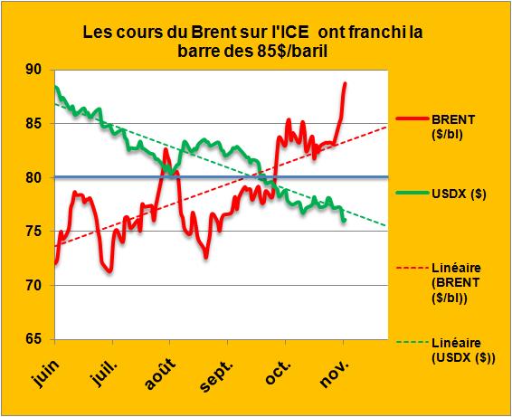 Nous avons assisté pour le Brent en début de semaine à un franchissement très rapide de la barre des 85$/baril (FIG., courbe rouge) atteignant des niveaux bien au dessus de la droite de corrélation des cinq derniers mois (pointillés rouges) alors que le cours du dollar contre les autres monnaies représenté par l’USDX côté sur l’ICE, poursuivait tranquillement sa décroissance, sans à coup notable (courbe verte). Cette rupture de symétrie par le haut est sûrement un signal fort pour une relance spéculative sur le pétrole et ses dérivés.