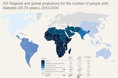 Mais voila, ces chiffres s’avèrent lourdement sous-estimés en raison en particulier d’une nouvelle estimation des cas de diabète en Chine publiée en Juin 2010 dans le New England Journal of Medecine (LIRE) qui revoyait le nombre de cas de diabète dans ce pays à 92,4 millions d’adultes contre 43,2 estimés jusque là. Cette seule correction porte donc l’estimation 2010 à 333 millions de cas et permet de projeter pour 2030 une estimation autour des 500 millions de cas de diabète dans le monde. Alors, 9% de la population adulte des 5,6 milliards des 20-79 ans dans le monde seront diabétiques.