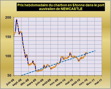 Un examen des cours du charbon pratiqués à la sortie du port de Newcastle en Australie, benchmark des prix du charbon en Asie, montre que depuis le printemps 2009 où ces cours avaient atteint leur plus bas vers les 60 dollars la tonne, ils ont depuis allègrement dépassé les 100 dollars la tonne pour atteindre les 108$ en début de ce mois. Cette valorisation provient essentiellement de la demande croissante de deux grands consommateurs de charbon en Asie: l’Inde et la Chine. L’Inde possède d’immenses ressources de charbon dans son sous-sol, mais elle ne sait pas l’acheminer dans ses vastes territoires. Des centrales électriques indiennes, situées dans les ports, sont alimentées de ce fait par du charbon australien, sud-africain ou indonésien. Quand à la Chine, sa boulimie énergétique n’est plus à décrire. Tout est bon pour brûler du charbon dans ce pays. Un exemple: la Province de Guizhou vient d’obtenir le feu vert de la part de la puissante National Energy Administration communiste pour planifier la réalisation d’une unité de transformation du type coal-to-liquid (CTL) d’ici à 2015. Cette unité qui produira annuellement 5 millions de tonnes de produits types pétroliers (dans les 100 mille barils par jour) à partir d’un procédé chinois validé sur une unité pilote de 0,16 million de tonnes implantée à Yiatai en Mongolie Intérieure. Pendant ce temps le chinois Shenhua qui voudrait installer une unité de 80 mille barils/jour et équipée de CCS, avec le sud-africain Sasol, attendra son tour…pas assez chinois.