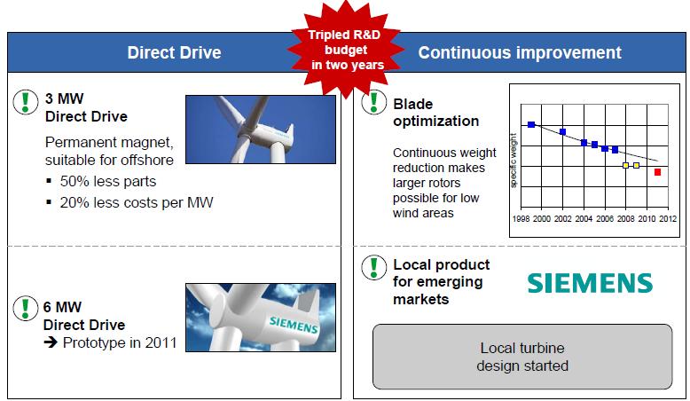 Siemens a donc décidé de mettre le paquet sur la diversification géographique de son activité éolienne et d’investir en outils de production dans les pays majeurs que sont la Chine et l’Amérique du Nord, mais aussi en Grande-Bretagne, en Inde et, sous forme d’une JV, en Russie. Il annonce vouloir disposer de 12 centres de production de turbines dans sept pays dès 2012-2013 contre 7 centres dans 3 pays aujourd’hui. Le constructeur allemand semble vouloir adopter la démarche commerciale du danois Vestas qui sur un marché se présente comme un constructeur local qui mérite donc de profiter des aides gouvernementales.