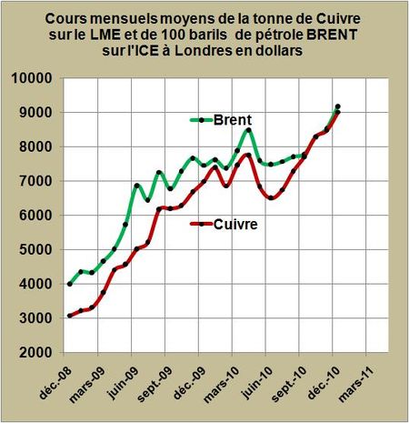 En deux ans les cours du Cuivre à plus de 9200 $ la tonne, ont été multipliés par trois (FIG.), ceux du pétrole à 92 $ le baril de Brent, par 2,3. Le synchronisme des deux courbes entre la tonne de cuivre et les cents barils de pétrole entre Décembre 2008 et Décembre 2010 est franchement époustouflant, la corrélation linéaire entre les deux paramètres affiche un coefficient de corrélation de 0,95. La corrélation quadratique affiche un coefficient de 0,96, traduisant une accélération des cours du cuivre au second semestre 2010 de façon plus précoce que celle du pétrole. Ce retard à l’allumage du deuxième rallye en cours sur les prix du pétrole s’explique essentiellement par la taille du marché et la nécessité de mettre en ordre de marche un grand nombre d’opérateurs. Mais il semblerait que sous l’œil bienveillant de l’OPEC, les manœuvres soient en marche vers les 100 dollars le baril…et plus si affinité (LIRE).