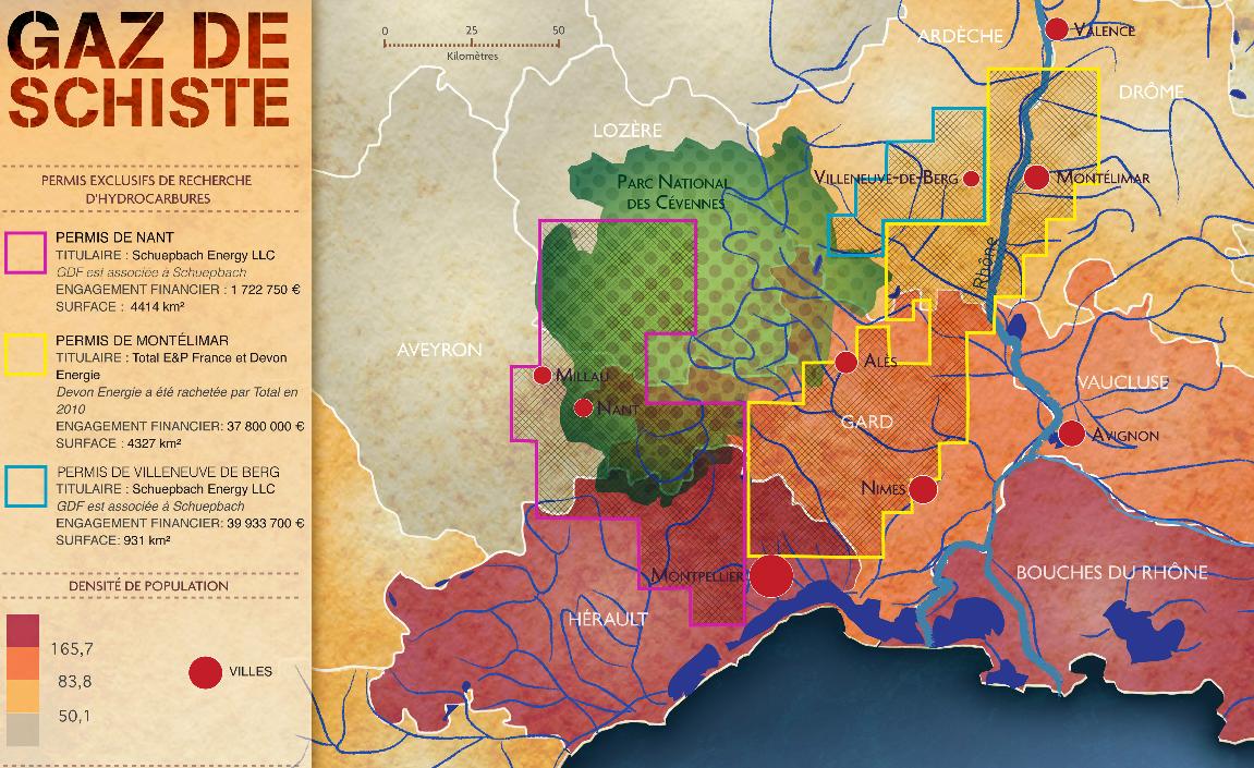 En ce moment en Europe c’est la ruée vers le gaz de schiste (gas rush) avec de nombreux opérateurs qui forent un peu partout: aux Pays-Bas, en Pologne, en Allemagne, en Angleterre, en Slovaquie, Roumanie, Bulgarie et même en Suisse. En France c’est le Bassin Parisien qui fait l’objet de bien des attentions: il ressemblerait au grand gisement de Bakken des États-Unis. Les gisements du Languedoc attribués en 2010 à divers acteurs devraient être eux aussi faire l’objet de forages exploratoires, mais notre ami Borloo a eu la fabuleuse idée d’inclure une partie du Larzac dans une aire de prospection (Permis de Nant, Carte II, partie verte). Il n’en fallait pas moins pour que le Bové José de « Gardarem lou Larzac » revenant du tribunal après jugement pour arrachage intempestif, se mobilise immédiatement pour stopper tout développement possible. C’est donc mal barré.