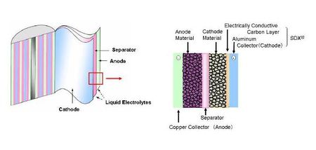 Depuis la sortie des premiers accumulateurs Li-Ion par Sony en 1991 qui reposaient sur les découvertes de l’intercalation des ions Lithium dans le graphite par Yazami à Grenoble en 1980 et les oxydes lithiés décrits par Goodenough, la technologie et la maîtrise de ces accumulateurs n’ont cessé de progresser. Ont été mentionnés ici tout dernièrement, les progrès accomplis dans les électrolytes solides, conducteurs des cations Li+, qui devraient permettre de définir des accumulateurs de hautes tensions et de sécuriser les batteries grâce à la suppression d’électrolyte organique inflammable (LIRE). Un autre axe majeur de progrès repose sur l’amélioration de la conductivité électronique des matériaux et des interfaces entre matériaux et supports. En effet une conductivité améliorée permet de faire fonctionner les électrodes de façon beaucoup plus homogène et donc de pouvoir atteindre des courants de charge ou de décharge plus élevés. Cette problématique a conduit les technologues à utiliser par exemple des nanofibres de carbone dans la masse positive cathodique composée d’un mélange intime d’oxydes ou de phosphates métalliques lithiés et de carbone. Mais un nouveau progrès majeur semble se démocratiser avec l’annonce par Showa Denko de commercialiser comme collecteur de courant  un feuillard d’aluminium revêtu de quelques microns d’épaisseur de carbone en surface. Ce nouveau composant présente la propriété de réduire la résistance électronique entre le feuillard et le matériau anodique, problème majeur dans le cas des cathodes à base de phosphate de fer lithié, LiFePO4.