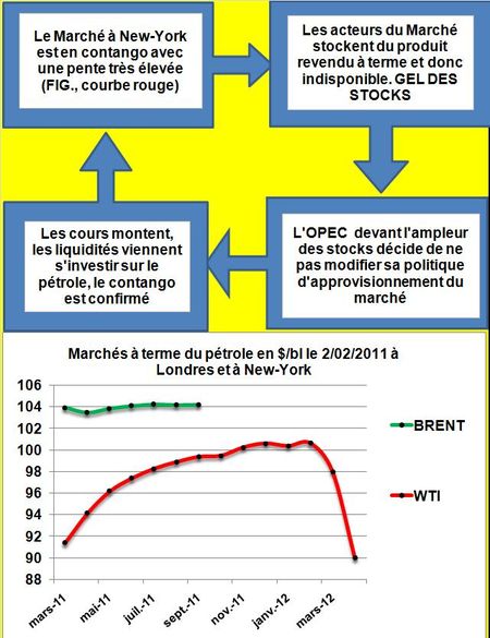 Il semblerait que les opérateurs aient biaisé en partie ce processus en opérant sur le Brent à Londres dont les cours à terme sont étales (courbe verte), mais en payant une PRIME DE FLUIDITÉ au marché de Londres de plus de 11$ le baril.