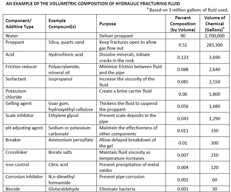 – la solution aqueuse de fracturation est composée de produits chimiques divers (TAB.) qui ne sont pas de violents poisons après dilution mais qu’il vaut mieux contenir et si possible récupérer. Citons par exemple des sables qui maintiennent les fissures ouvertes, de l’acide chlorhydrique qui va dissoudre certaines roches basiques, des huiles, des surfactants, des gélifiants, des inhibiteurs de corrosion, des agents de détartrage, des bactéricides, etc. Les boues qui sont remontées après fracturation peuvent également être polluées par entraînement de matériaux toxiques provenant du sos-sol fracturé.
