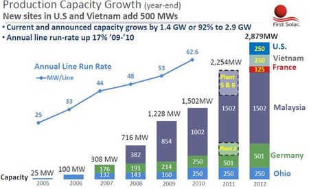 En 2010 First Solar disposait de 24 lignes de production dans le monde, à fin 2011 il en fera produire 36 et à fin 2012 il devrait pouvoir disposer de 10 lignes de production supplémentaires dont 4 aux USA, 4 au Vietnam et peut-être deux en France si EDF EN maintient ses projets d’investissements en Gironde malgré la toute récente limitation globale gouvernementale des installations photovoltaïques à 500 MW par an. Par la répartition des investissements entre pays à faible taux de main d’œuvre (Malaisie, Vietnam) et pays développés (Allemagne, États-Unis) First Solar essaie de ménager un mix politico-industriel optimal.