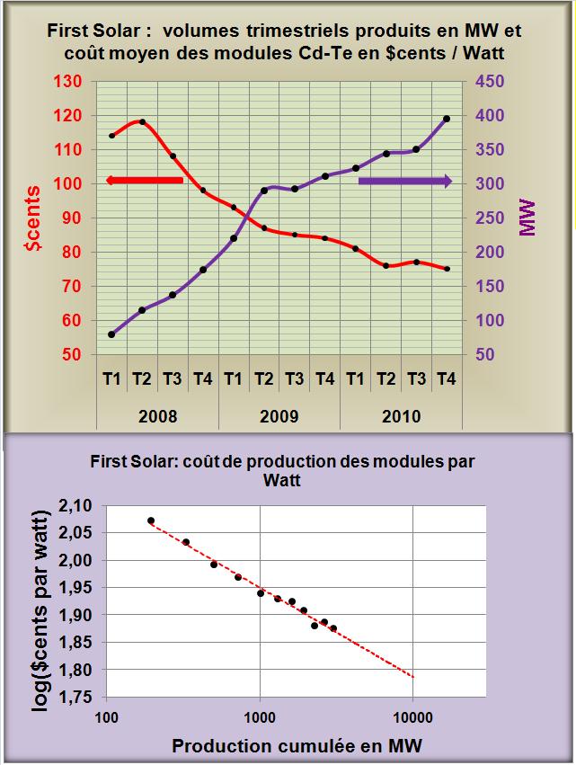 Les volumes de production en croissance permettent d’atteindre un coût industriel des modules ramené au Watt de 75 cents à fin 2010, venant de 84 cents à fin 2009, pour une production cumulée de plus de 3 GW. Cette progression (FIG.II) se traduit par une courbe d’expérience entre le log du coût et la production cumulée typique des industries de composants.