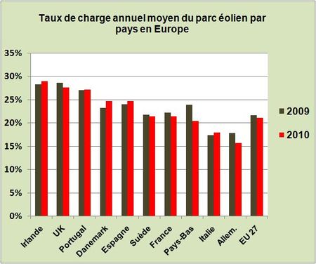 Il est intéressant à partir des puissances moyennes installées et de l’énergie éolienne produite par pays de comparer les taux de charge (TAB. et FIG.). Ils sont très dispersés en Europe puisqu’ils ont varié en 2010 entre 29% pour l’Irlande à moins de 16% pour l’Allemagne. L’Allemagne avec le premier parc éolien européen installé, n’est que le deuxième producteur d’électricité d’origine éolienne derrière l’Espagne avec respectivement 36,5 et 43 TWh générés. Ces chiffres permettent de comprendre pourquoi l’Allemagne pousse les feux vers l’éolien offshore qui devrait permettre en Mer du Nord d’atteindre pour ces nouvelles installations des taux de charge voisins de 40% (3500 heures/an).