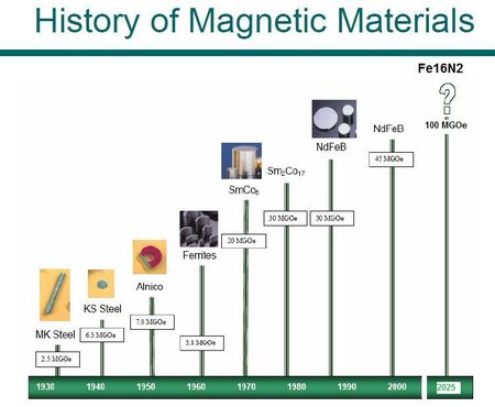 A plus long terme l’objectif des industriels japonais est de s’affranchir des Terres Rares dans les aimants. Dans ce but les équipes de Toda Kogyo en relation avec les universitaires travaillent sur la synthèse de quelques grammes et la maîtrise des propriétés magnétiques du nitrure de fer Fe16 N2. C’est un alliage qui sur le papier doit pouvoir atteindre une force d’aimantation 30% supérieure à celle des meilleurs aimants du moment avec une énergie magnétique produit de 100 MGOe (Megagauss-Oersted) ou 796 kJoule/m3, qui est l’énergie spécifique qui caractérise la force d’aimantation.