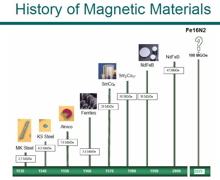 A plus long terme l’objectif des industriels japonais est de s’affranchir des Terres Rares dans les aimants. Dans ce but les équipes de Toda Kogyo en relation avec les universitaires travaillent sur la synthèse de quelques grammes et la maîtrise des propriétés magnétiques du nitrure de fer Fe16 N2. C’est un alliage qui sur le papier doit pouvoir atteindre une force d’aimantation 30% supérieure à celle des meilleurs aimants du moment avec une énergie magnétique produit de 100 MGOe (Megagauss-Oersted) ou 796 kJoule/m3, qui est l’énergie spécifique qui caractérise la force d’aimantation.