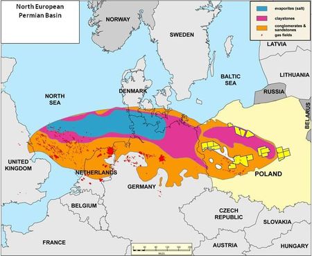 Cette aventure se poursuit activement en Pologne (FIG.) qui a accordé 70 concessions d’exploration-production depuis deux ans. La Pologne pour des raisons historiques, ne veut pas dépendre de son trop gros voisin la Russie pour son approvisionnement en gaz naturel. La Compagnie polonaise PNGiG associée à FX Energy vient de mettre en production dans ces mêmes grès de Rotliegen, dans la concession de Fences située dans le quart sud-ouest de la Pologne un forage qui débite 7,7 MMcf de gaz par jour et dont le débit pourrait monter jusqu’à 13,4 MMcf par jour. Les réserves prouvées et estimées de ce gisement seraient comprises entre 26 et 36 Bcf (milliards de pieds cubes, il faut diviser par 35,3 pour passer du pied cube au mètre cube).