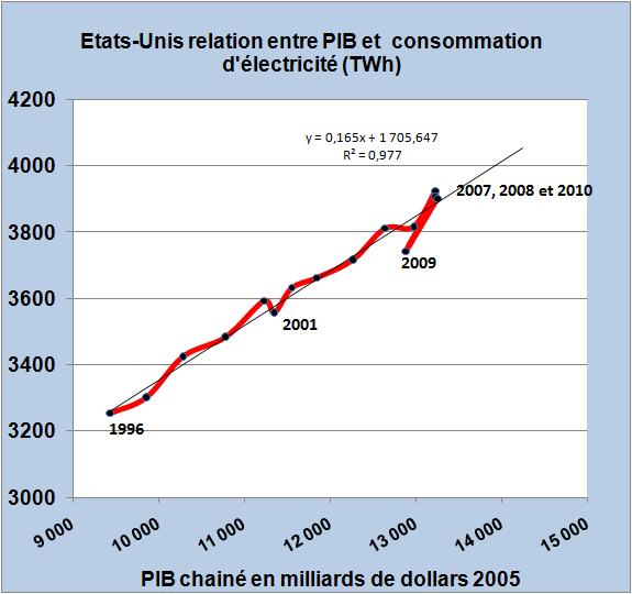 Après la stabilisation du PIB de ce pays en 2008 et le recul observé en 2009 suivi d’une reprise en 2010, il est possible d’observer que les consommations d’électricité ont parfaitement répliqué ce va-et-vient économique de ces trois dernières années tout en s’inscrivant dans la tendance décennale des consommations d’énergie électrique qui varie de façon sensiblement linéaire avec une pente de 0,165 TWh par milliard de dollars « 2005 » de PIB. La même courbe portant sur les productions nettes montre une pente de 0,176 TWh par milliard de dollars « 2005 » de PIB. Ceci correspond à 0,15 TWh par milliard de dollars de PIB 2010 pour la consommation et à 0,16 TWh pour la production nette.
