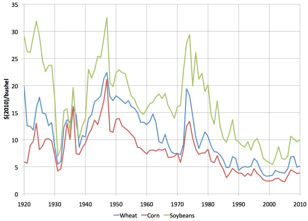 – les prix en dollars du blé, du maïs, du soja relevés sur plusieurs décennies sont en forte décroissance (FIG.I, empruntée à Staniford) et les dernières hausses enregistrées sont finalement assez modestes.