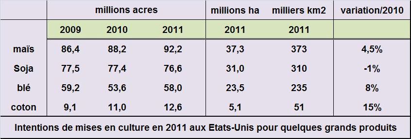Pour illustrer cette adaptation du monde agricole aux demandes du marché il est intéressant de se pencher sur les intentions de mises en cultures et leurs surfaces en 2011 aux États-Unis publiées par l’USDA (TAB.).