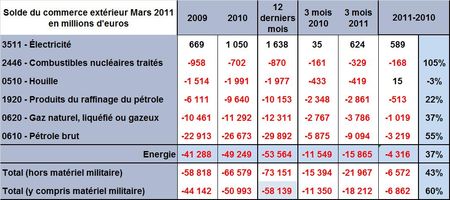 4 réponses à “La facture énergétique de la France s’est accrue en un an de 37% au premier trimestre 2011”